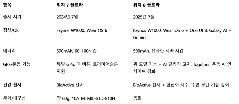 가장 궁금해하실 부분입니다. 2025년에 출시된 갤럭시 워치8 울트라, 과연 워치7 울트라에서 업그레이드할 만큼의 차이가 있을까요?