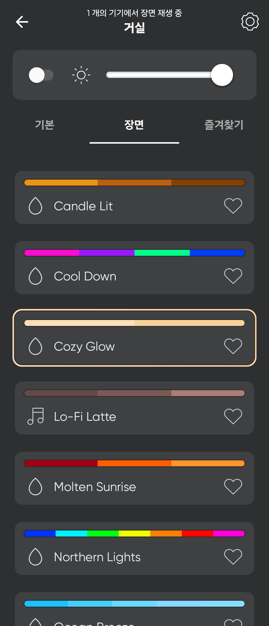 나노리프 앱에서는 7개의 장면과 3개의 뮤직 장면이 있습니다.