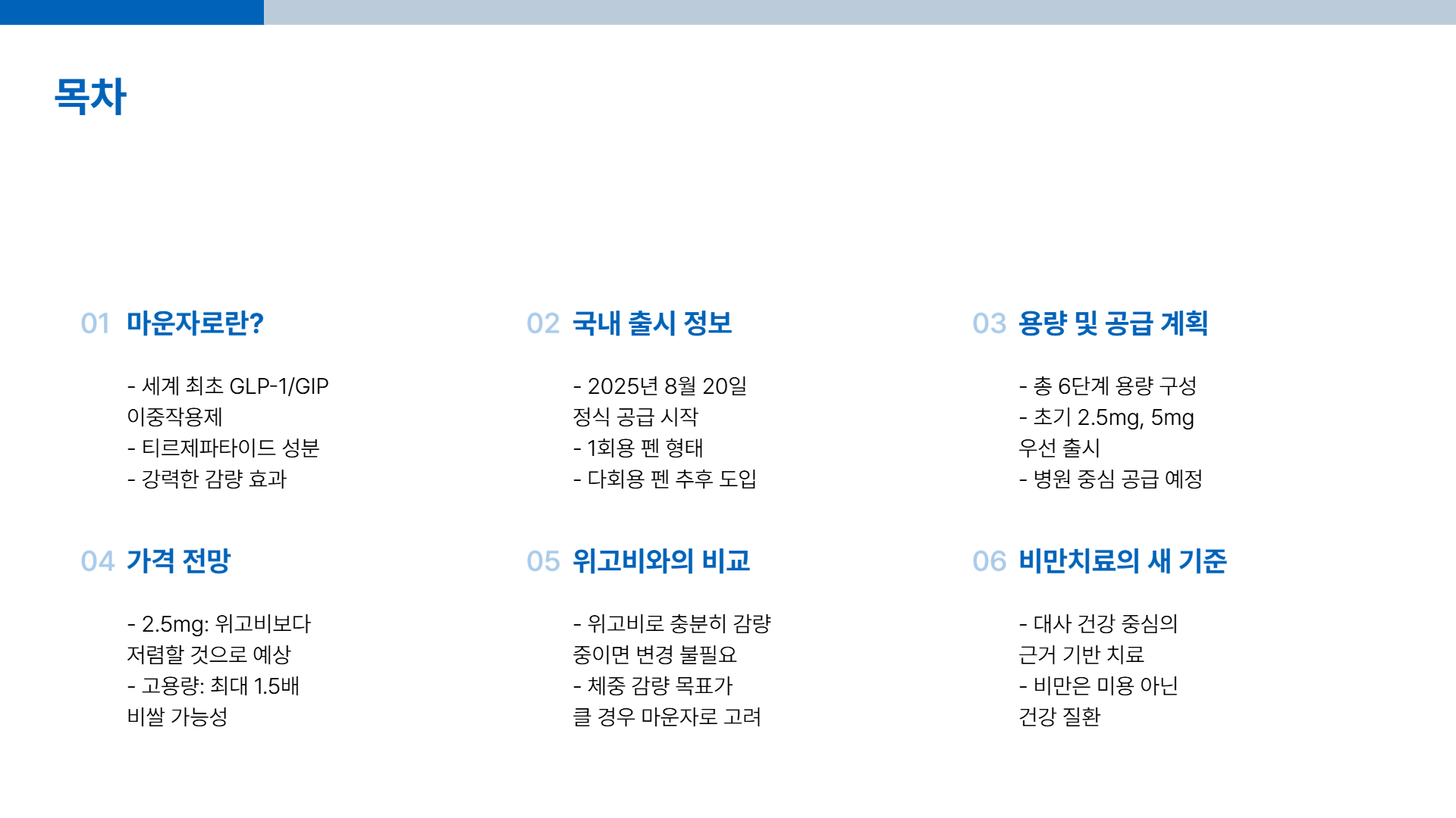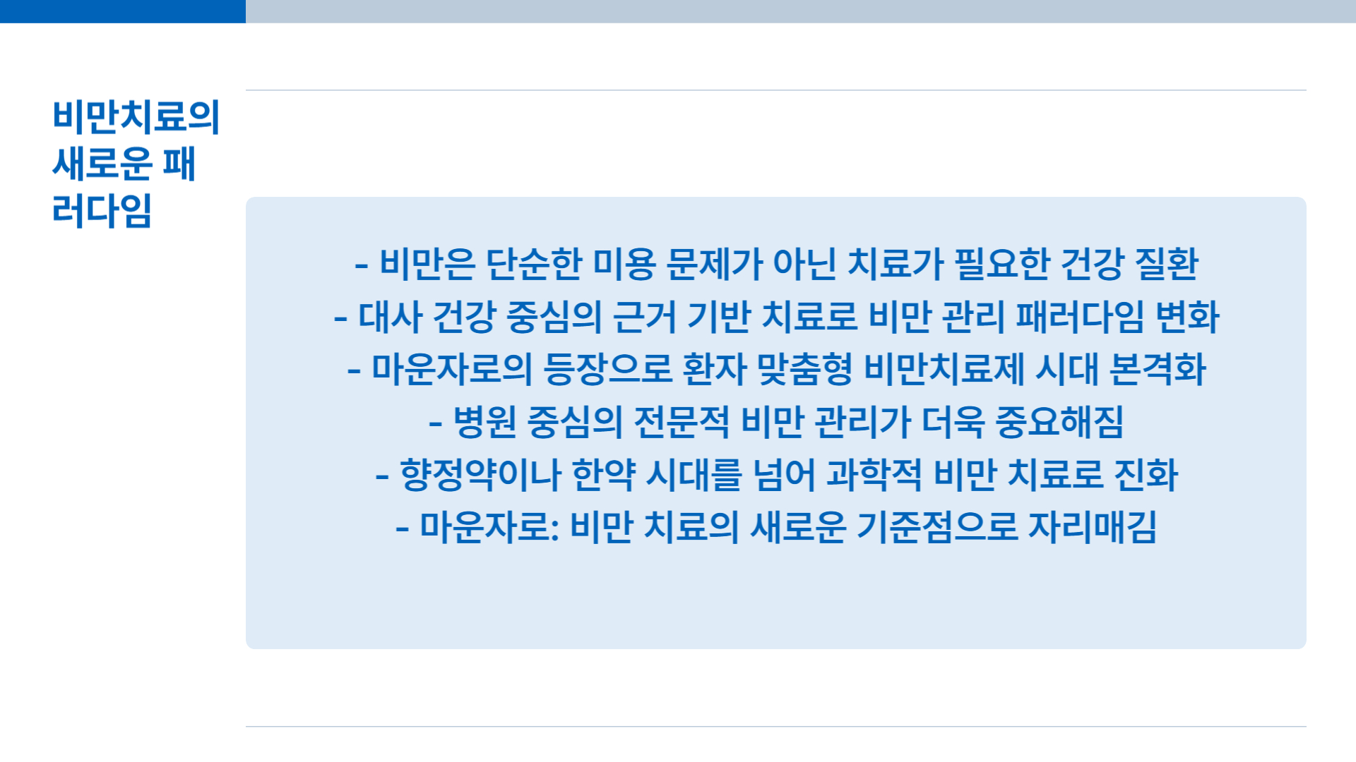 비만치료는 이제 향정약이나 한약의 시대를 넘어, 대사 건강을 중심으로 한 근거 기반 치료로 진화하고 있습니다. 마운자로의 등장은 그 속도를 더 앞당길 것입니다.