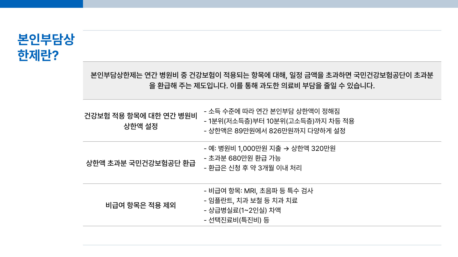본인부담상한제는 연간 병원비 중 건강보험이 적용되는 항목에 대해, 일정 금액을 초과하면 국민건강보험공단이 초과분을 환급해 주는 제도입니다.