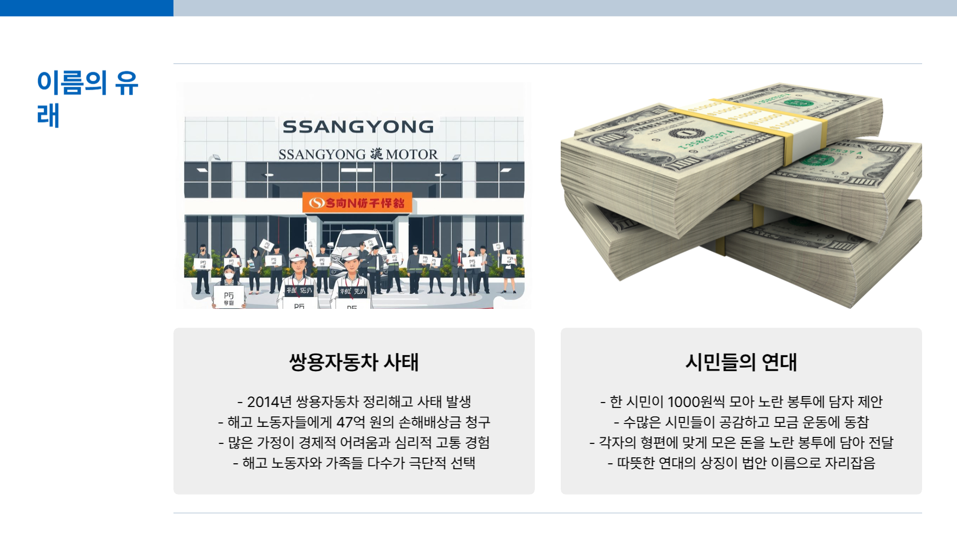 이 법의 별명에는 가슴 따뜻해지는 이야기가 숨겨져 있습니다. 시계를 2014년으로 돌려볼게요. 당시 쌍용자동차 정리해고 사태로 고통받던 노동자들이 있었습니다. 이들을 돕기 위해 한 시민이 언론에 "해고 노동자에게 47억 원의 손해배상금을 청구하는 것은 너무 가혹하다"는 호소와 함께 "1000원씩 모아 노란 봉투에 담아 전달하자"는 제안을 했습니다. 이 제안에 수많은 시민들이 공감하고 동참했죠. 각자의 형편에 맞게 돈을 모아 노란 봉투에 담아 보냈고, 그 따뜻한 연대는 어려운 이웃에게 힘이 되는 상징이 되었습니다. 바로 그 따뜻한 마음과 연대의 정신이 담겨, 이 법안의 별명으로 자리 잡게 된 것이랍니다.