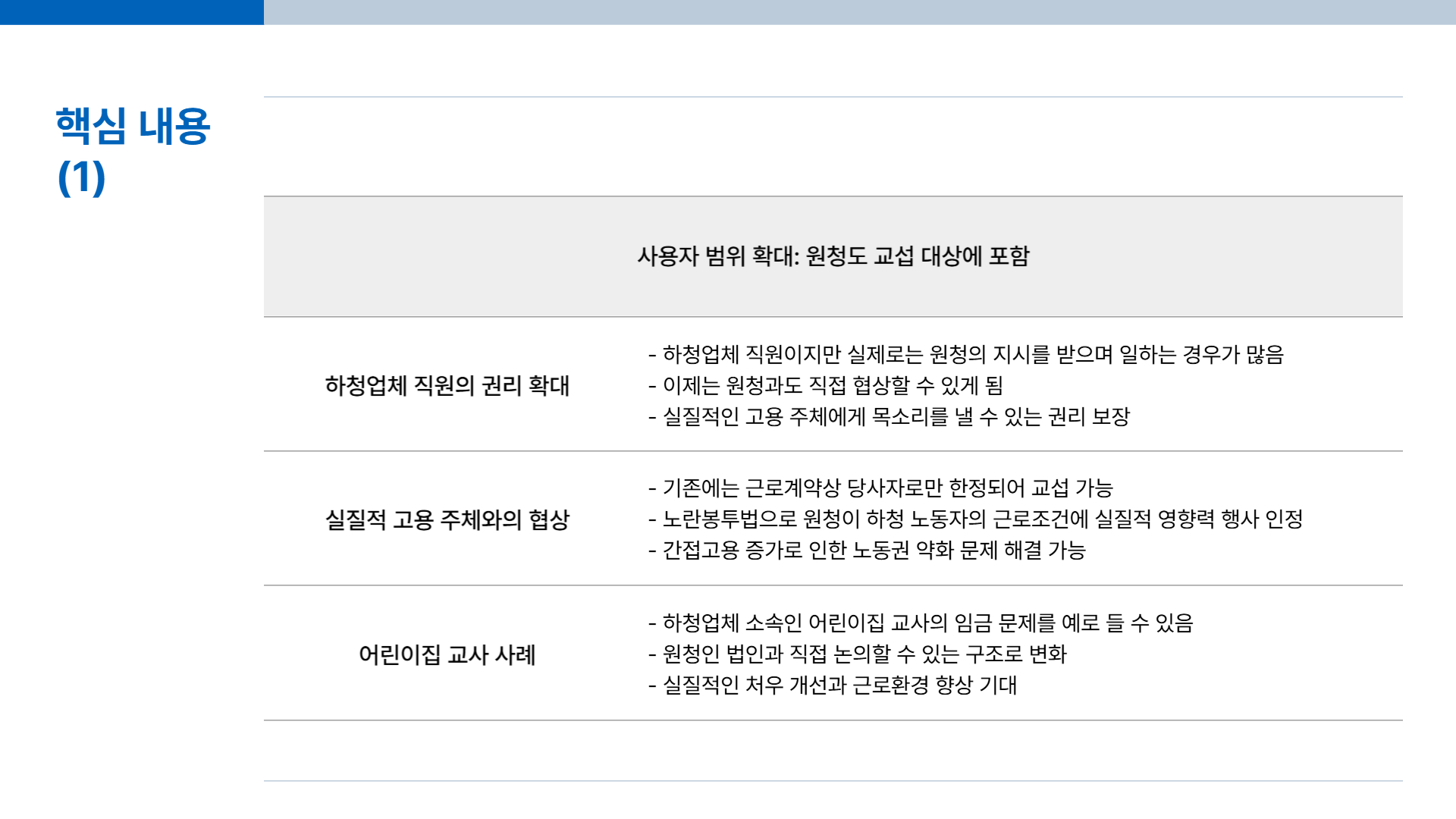 | 사용자 범위 확대 | 원청도 교섭 대상에 포함 | 하청업체 직원이지만 실제로는 원청의 지시를 받으며 일하는 경우가 많죠. 이제는 원청과도 직접 협상할 수 있게 되어, 실질적인 고용 주체에게 목소리를 낼 수 있게 됩니다. 예를 들어, 하청업체 소속인 어린이집 교사의 임금 문제를 원청인 법인과 직접 논의할 수 있는 구조가 되는 셈이죠. |