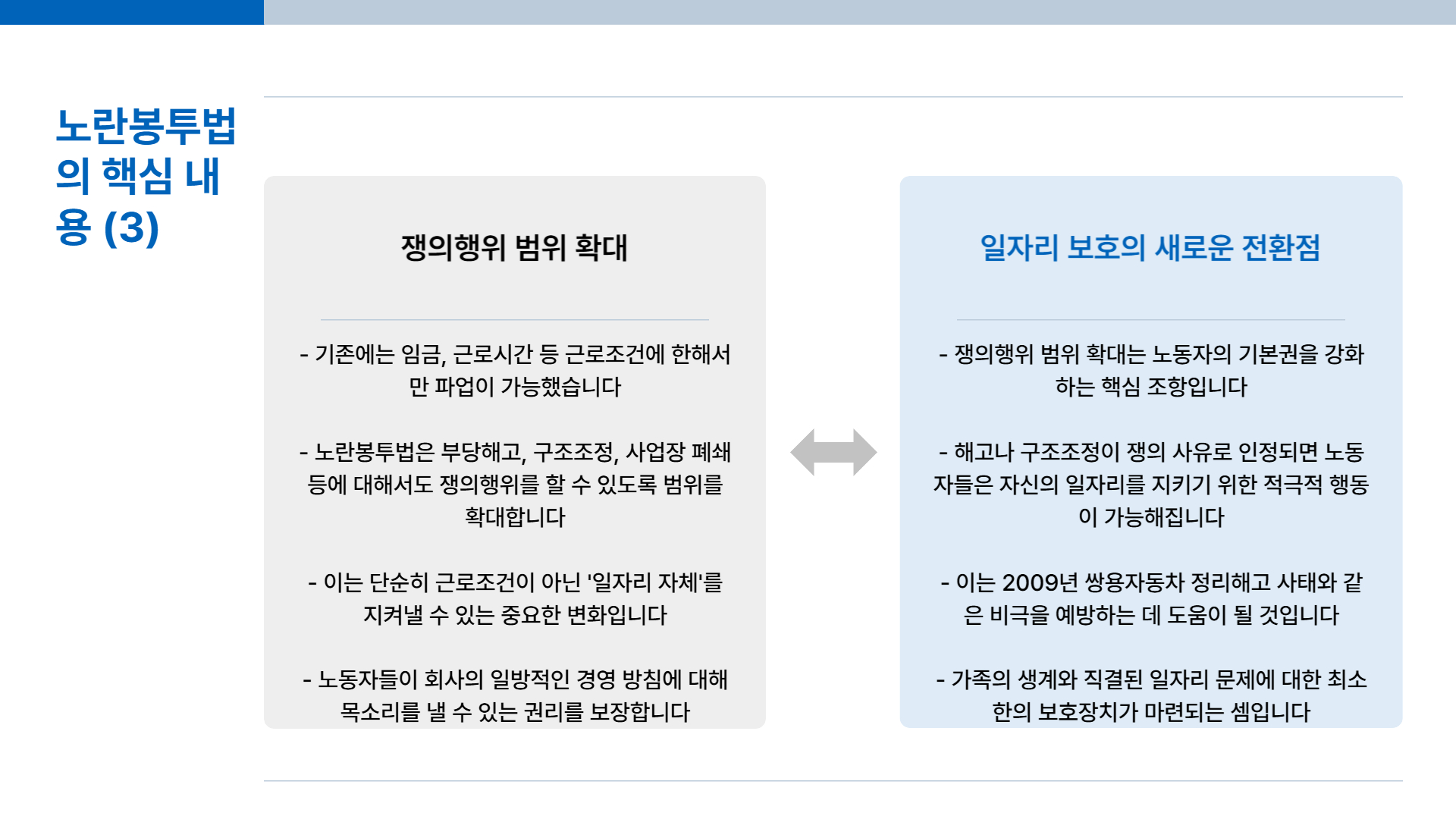| 쟁의행위 범위 확대 | 해고·구조조정도 쟁의 사유 인정 | 기존에는 임금, 근로시간 등 근로조건에 한해서만 파업을 할 수 있었습니다. 하지만 이 법이 통과되면 부당해고, 구조조정, 사업장 폐쇄 등 회사의 경영 방침에 대해서도 노동자들이 "NO!"라고 외칠 권리를 가질 수 있게 됩니다. 단순히 월급 문제만이 아니라, 우리의 '일자리' 자체를 지켜낼 수 있는 중요한 변화죠. |