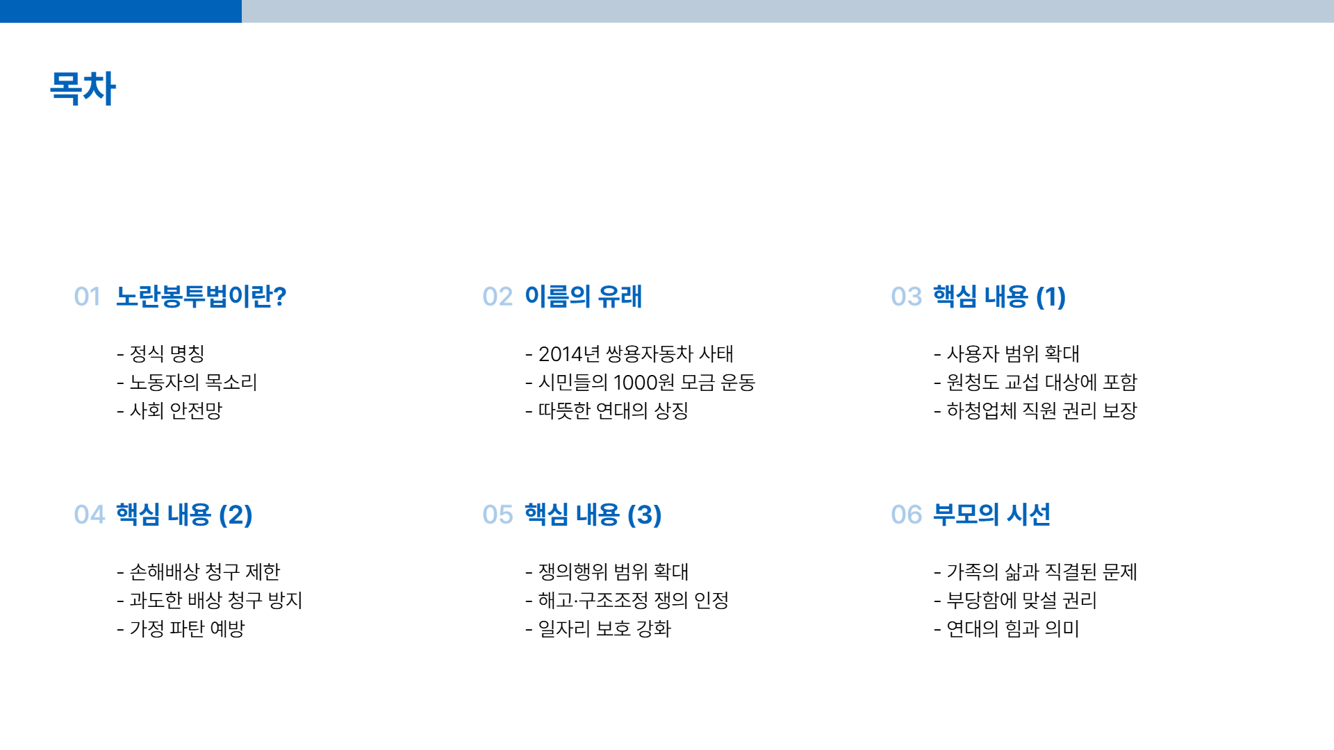 이 법은 단순히 파업을 돕는 법이 아닙니다. 이 법의 핵심은 "일터에서 부당함에 대해 말할 수 있는 자유, 그리고 가족의 삶을 지켜낼 수 있는 권리"를 보장하는 최소한의 울타리를 만드는 데 있습니다. 내가 겪는 부당함이 나 혼자만의 싸움이 아니라, 연대의 힘으로 해결할 수 있도록 돕는 따뜻한 법인 셈이죠.
