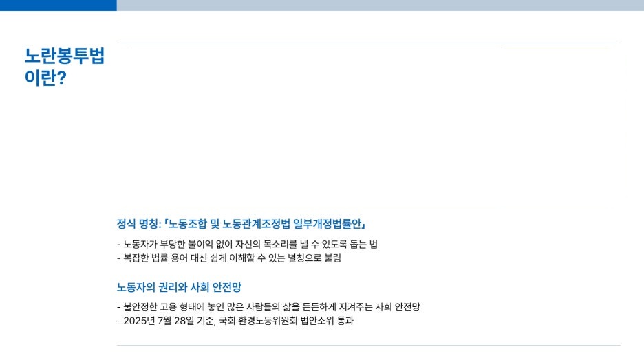 정식 명칭은 「노동조합 및 노동관계조정법 일부개정법률안」입니다. 이름부터 너무 어렵죠? 쉽게 풀어 말하자면, "노동자가 부당한 불이익 없이 자신의 목소리를 낼 수 있도록 돕는 법"이라고 할 수 있어요. 더 나아가, 불안정한 고용 형태에 놓인 많은 사람들의 삶을 든든하게 지켜줄 수 있는 '사회 안전망'을 만들려는 노력이라고 이해하면 좋습니다.