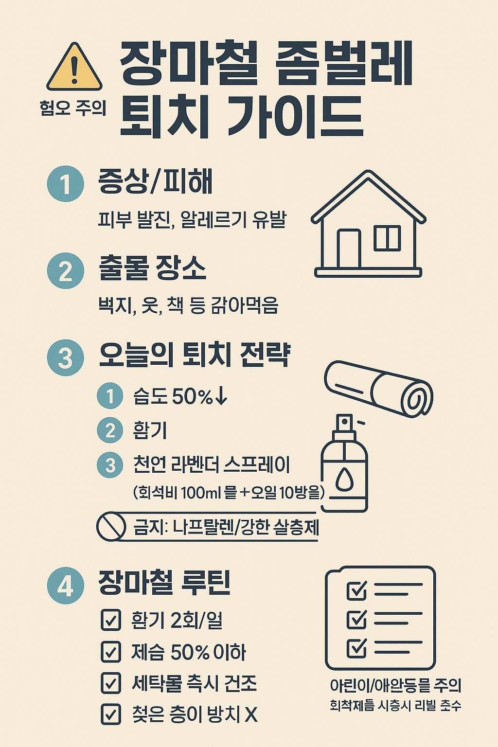 좀벌레는 예방이 곧 최고의 퇴치법입니다. 이번 장마철, 집안 습도만 잘 관리해도 벌레 걱정 없는 여름을 보낼 수 있습니다.