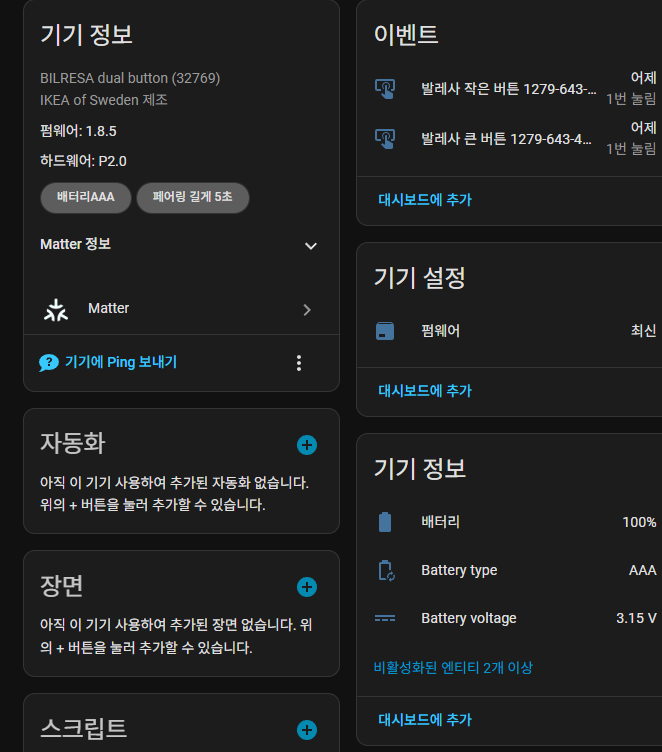 연결을 하게 되면 이런 식으로 구성요소가 생성되는데 버튼을 한 번씩 눌러서 이벤트를 생성해야 자동화를 만들 수가 있습니다.