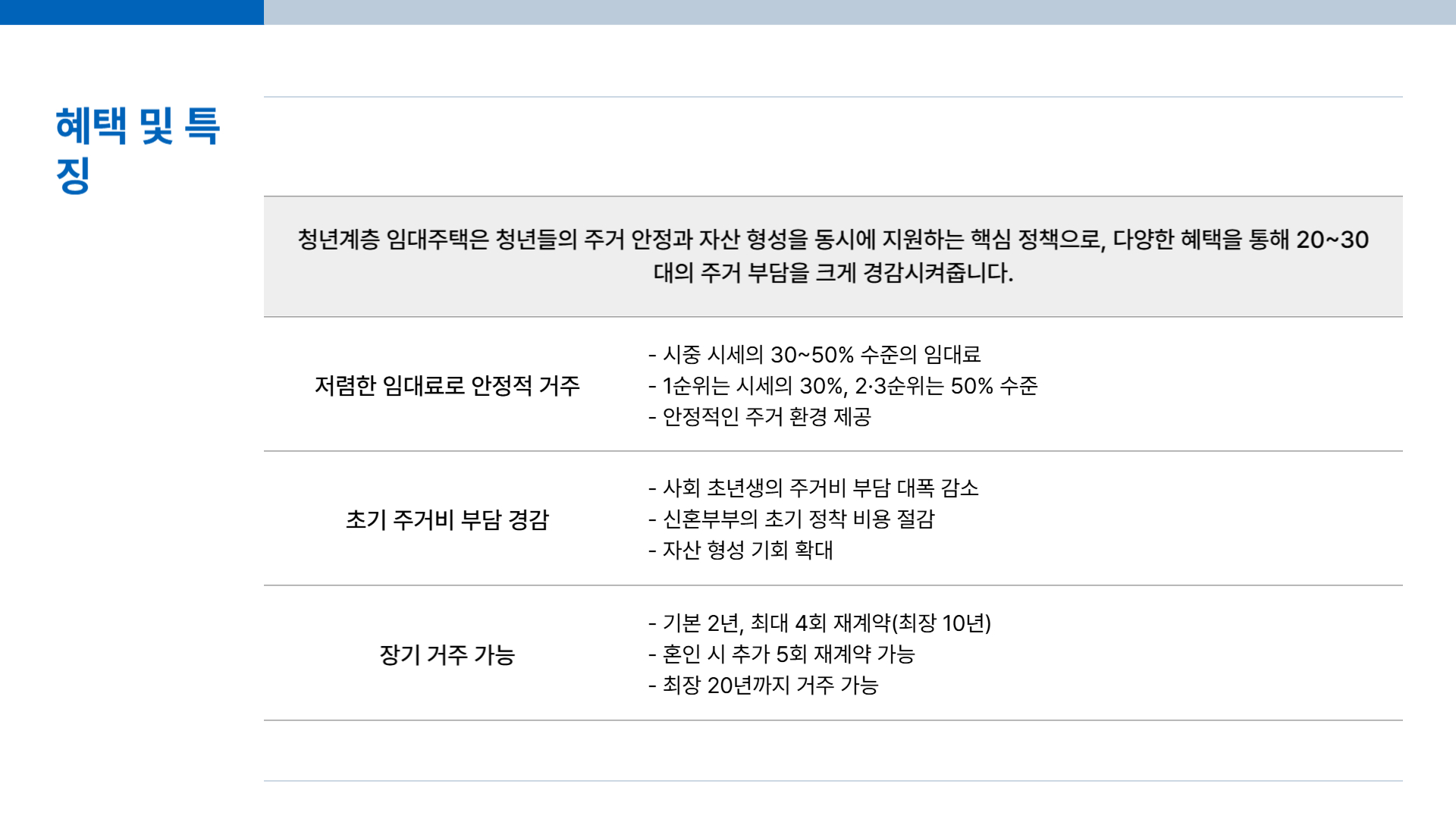 청년계층 임대주택은 시세의 절반 수준으로 장기간 안정적인 거주가 가능하다는 점에서 큰 메리트가 있습니다. 특히 사회 초년생이나 신혼부부에게는 초기 주거비 부담을 대폭 줄여주는 든든한 정책이죠.