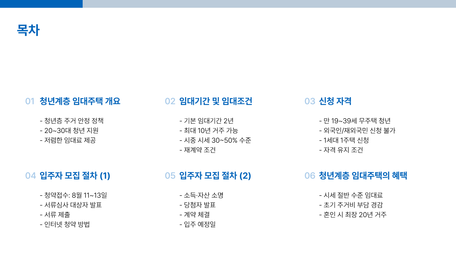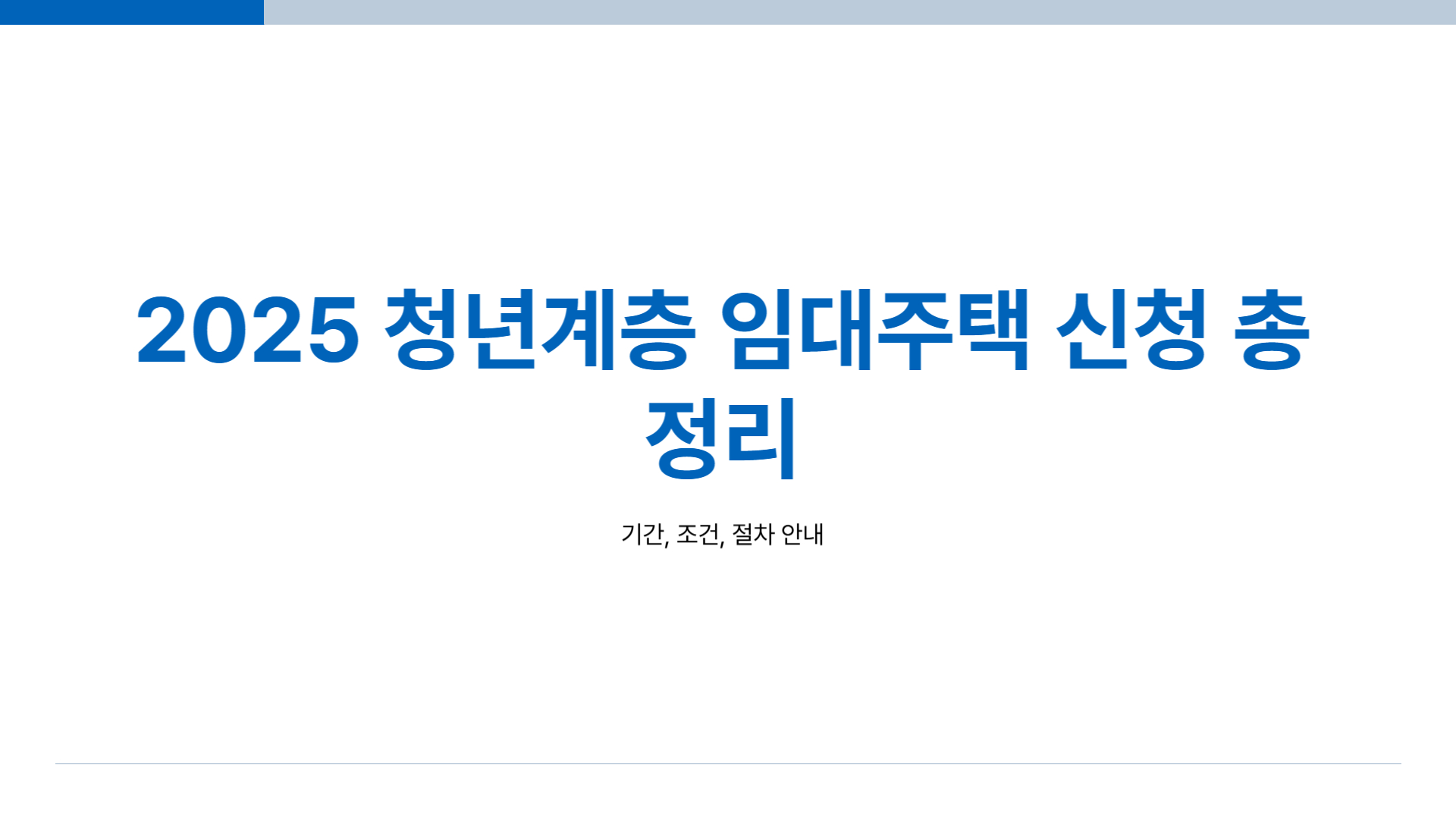 청년층을 위한 임대주택은 주거 안정과 자산 형성을 동시에 지원하기 위한 핵심 정책 중 하나입니다. 특히 20~30대 청년들이 안정적인 거주지를 마련하는 데 큰 도움을 주는데요. 이번 글에서는 2025년 청년계층 임대주택의 임대 조건, 신청 자격, 모집 일정 등을 한눈에 보기 좋게 정리했습니다.