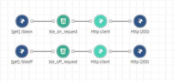 [{"id":"4b6338a3.308c88","type":"function","z":"6483d093.a364c","name":"ble_on_request","func":"msg.headers = {};\nmsg.method = \"POST\";\nmsg.url = \"https://api.smartthings.com/v1/devices/장치ID/commands\" ;\nmsg.headers['Authorization'] = \"Bearer 토큰입력\";\nmsg.payload = {\n \"commands\": [\n {\n \"component\": \"ble\",\n \"capability\": \"pilotgreen48610.presenseswitch\",\n \"command\": \"on\"\n }]\n}\nreturn msg;","outputs":1,"noerr":0,"x":244.00000381469727,"y":373.8999996185303,"wires":[["7d977290.d4ecbc"]]},{"id":"6ae46f61.b77b1","type":"http in","z":"6483d093.a364c","name":"","method":"get","url":"/bleoff","isUnique":true,"endpoint":"https://as-1bac94f5-3153-4a6d-acfd-68f22cc2bb1d.app.scf.ane2.devground.io/6483d093.a364c/bleoff","upload":false,"x":99.00000381469727,"y":478.89998626708984,"wires":[["df7acc25.19bb2"]]},{"id":"7d977290.d4ecbc","type":"http client","z":"6483d093.a364c","name":"","method":"use","ret":"txt","url":"","useAuth":false,"x":374.00000762939453,"y":373.8999996185303,"wires":[["a7e25f22.843a8"]]},{"id":"7edd12e7.f9049c","type":"http in","z":"6483d093.a364c","name":"","method":"get","url":"/bleon","isUnique":true,"endpoint":"https://as-1bac94f5-3153-4a6d-acfd-68f22cc2bb1d.app.scf.ane2.devground.io/6483d093.a364c/bleon","upload":false,"x":100,"y":373.8999996185303,"wires":[["4b6338a3.308c88"]]},{"id":"997dba5a.2d0a08","type":"http client","z":"6483d093.a364c","name":"","method":"use","ret":"txt","url":"","useAuth":false,"x":373.0000114440918,"y":478.89998626708984,"wires":[["dbdd6d3b.d8935"]]},{"id":"a7e25f22.843a8","type":"http response","z":"6483d093.a364c","name":"","statusCode":"200","headers":{},"x":512.0000076293945,"y":373.8999996185303,"wires":[]},{"id":"dbdd6d3b.d8935","type":"http response","z":"6483d093.a364c","name":"","statusCode":"200","headers":{},"x":511.0000114440918,"y":478.89998626708984,"wires":[]},{"id":"df7acc25.19bb2","type":"function","z":"6483d093.a364c","name":"ble_off_request","func":"msg.headers = {};\nmsg.method = \"POST\";\nmsg.url = \"https://api.smartthings.com/v1/devices/장치ID/commands\" ;\nmsg.headers['Authorization'] = \"Bearer 토큰입력\";\nmsg.payload = {\n \"commands\": [\n {\n \"component\": \"ble\",\n \"capability\": \"pilotgreen48610.presenseswitch\",\n \"command\": \"off\"\n }]\n}\nreturn msg;","outputs":1,"noerr":0,"x":243.00000762939453,"y":478.89998626708984,"wires":[["997dba5a.2d0a08"]]}]
