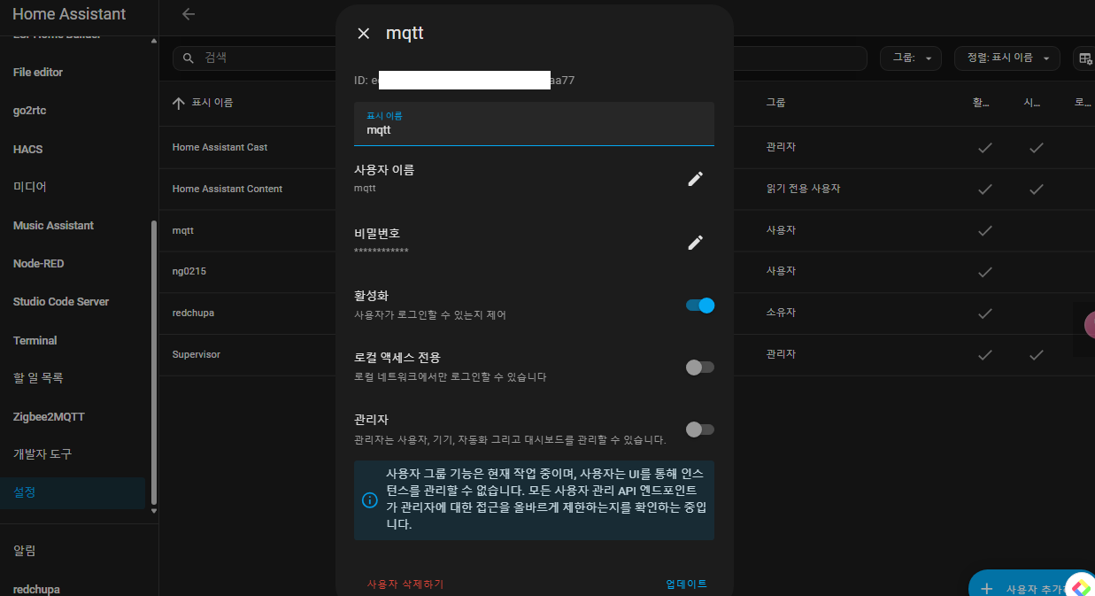 ps 저는 mqtt 계정도 별도로 생성해 놨습니다 (월패드의 fully 브라우저 계정으로 사용)