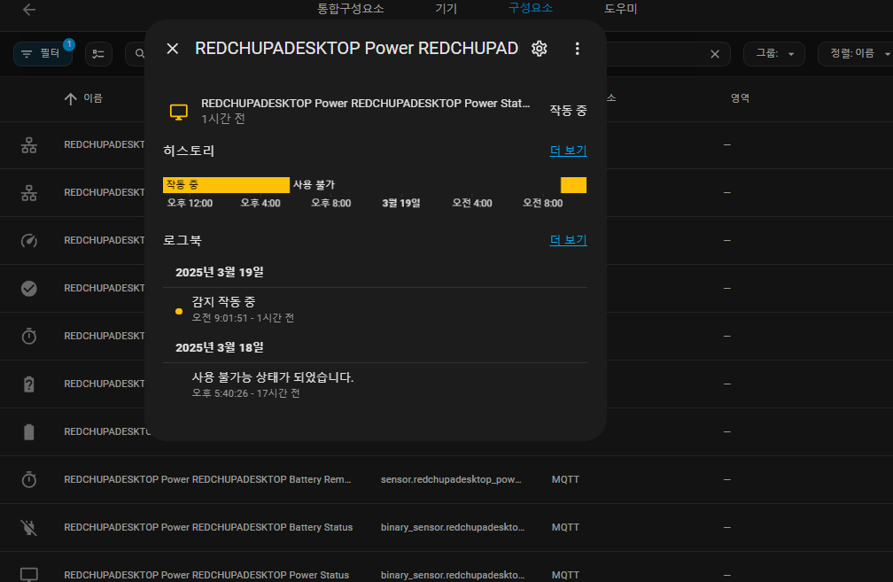 PC상태가 홈어시스턴트서버와 연동되었다면 아래와 같은 구성요소가 발견됩니다.