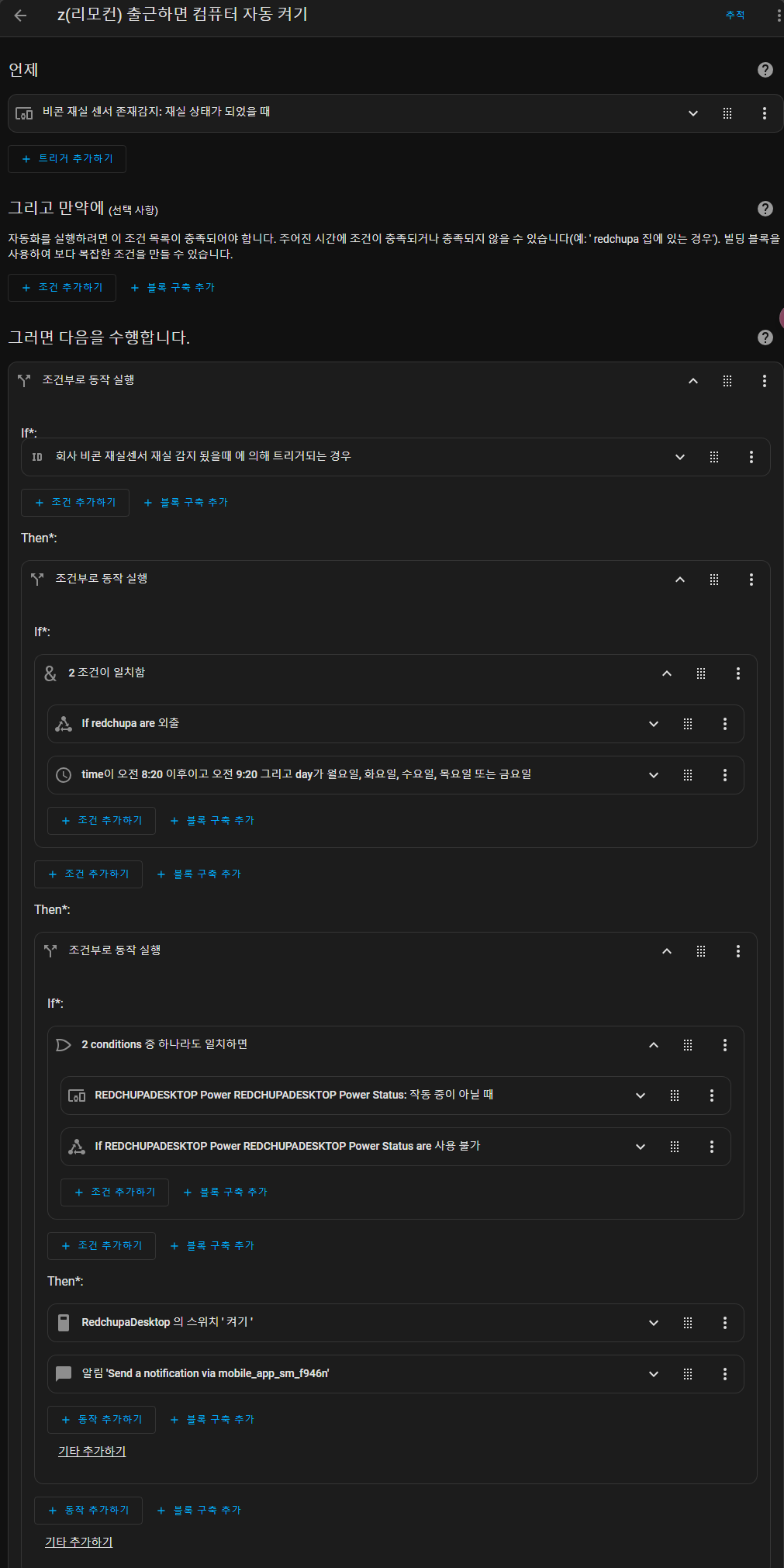 이렇게 자동화를 구성하면 회사에 도착하면 컴퓨터가 꺼져있을 때 알아서 집 컴퓨터를 켜줍니다