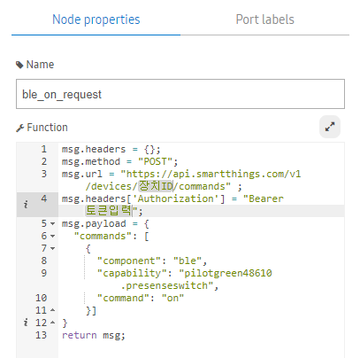 [{"id":"4b6338a3.308c88","type":"function","z":"6483d093.a364c","name":"ble_on_request","func":"msg.headers = {};\nmsg.method = \"POST\";\nmsg.url = \"https://api.smartthings.com/v1/devices/장치ID/commands\" ;\nmsg.headers['Authorization'] = \"Bearer 토큰입력\";\nmsg.payload = {\n \"commands\": [\n {\n \"component\": \"ble\",\n \"capability\": \"pilotgreen48610.presenseswitch\",\n \"command\": \"on\"\n }]\n}\nreturn msg;","outputs":1,"noerr":0,"x":244.00000381469727,"y":373.8999996185303,"wires":[["7d977290.d4ecbc"]]},{"id":"6ae46f61.b77b1","type":"http in","z":"6483d093.a364c","name":"","method":"get","url":"/bleoff","isUnique":true,"endpoint":"https://as-1bac94f5-3153-4a6d-acfd-68f22cc2bb1d.app.scf.ane2.devground.io/6483d093.a364c/bleoff","upload":false,"x":99.00000381469727,"y":478.89998626708984,"wires":[["df7acc25.19bb2"]]},{"id":"7d977290.d4ecbc","type":"http client","z":"6483d093.a364c","name":"","method":"use","ret":"txt","url":"","useAuth":false,"x":374.00000762939453,"y":373.8999996185303,"wires":[["a7e25f22.843a8"]]},{"id":"7edd12e7.f9049c","type":"http in","z":"6483d093.a364c","name":"","method":"get","url":"/bleon","isUnique":true,"endpoint":"https://as-1bac94f5-3153-4a6d-acfd-68f22cc2bb1d.app.scf.ane2.devground.io/6483d093.a364c/bleon","upload":false,"x":100,"y":373.8999996185303,"wires":[["4b6338a3.308c88"]]},{"id":"997dba5a.2d0a08","type":"http client","z":"6483d093.a364c","name":"","method":"use","ret":"txt","url":"","useAuth":false,"x":373.0000114440918,"y":478.89998626708984,"wires":[["dbdd6d3b.d8935"]]},{"id":"a7e25f22.843a8","type":"http response","z":"6483d093.a364c","name":"","statusCode":"200","headers":{},"x":512.0000076293945,"y":373.8999996185303,"wires":[]},{"id":"dbdd6d3b.d8935","type":"http response","z":"6483d093.a364c","name":"","statusCode":"200","headers":{},"x":511.0000114440918,"y":478.89998626708984,"wires":[]},{"id":"df7acc25.19bb2","type":"function","z":"6483d093.a364c","name":"ble_off_request","func":"msg.headers = {};\nmsg.method = \"POST\";\nmsg.url = \"https://api.smartthings.com/v1/devices/장치ID/commands\" ;\nmsg.headers['Authorization'] = \"Bearer 토큰입력\";\nmsg.payload = {\n \"commands\": [\n {\n \"component\": \"ble\",\n \"capability\": \"pilotgreen48610.presenseswitch\",\n \"command\": \"off\"\n }]\n}\nreturn msg;","outputs":1,"noerr":0,"x":243.00000762939453,"y":478.89998626708984,"wires":[["997dba5a.2d0a08"]]}]