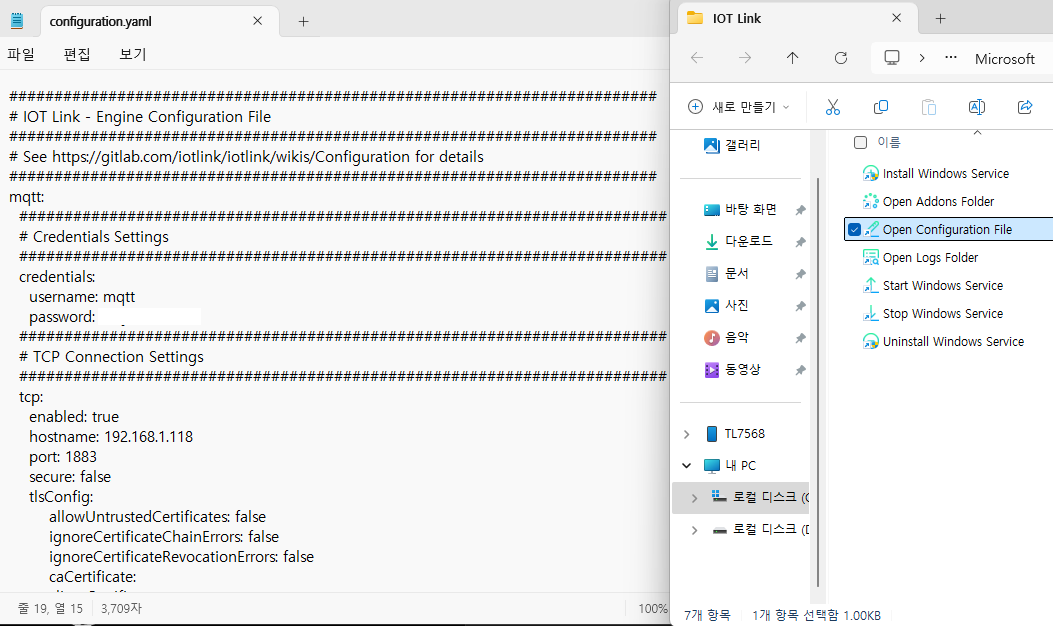 다음 다음을 눌러 설치 후에 Open Configuration File을 열어 HA 서버의 아이피와 mqtt 포트, 계정을 입력해 줍니다.