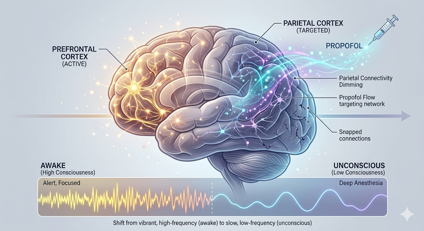 이 경험은 단순히 “잠들었다가 깨어났다”라고 표현되지만, 실제로는 훨씬 복잡한 뇌의 변화가 일어납니다. 특히 현대 의료에서 널리 사용되는 프로포폴(Propofol)이라는 마취제는 뇌의 특정 네트워크를 재구성하여 의식을 일시적으로 차단합니다.