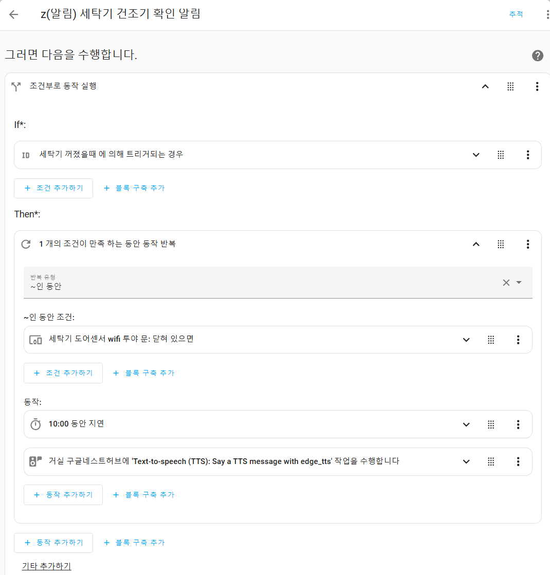 세탁기 드레스룸 팬트리 같이 항상 꺼져야 될 기기들의 경우 등을 묶음으로 자동화를 구성한다.