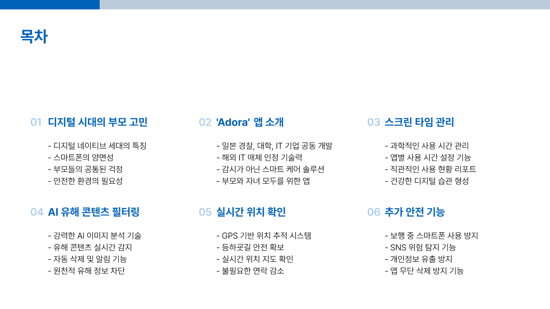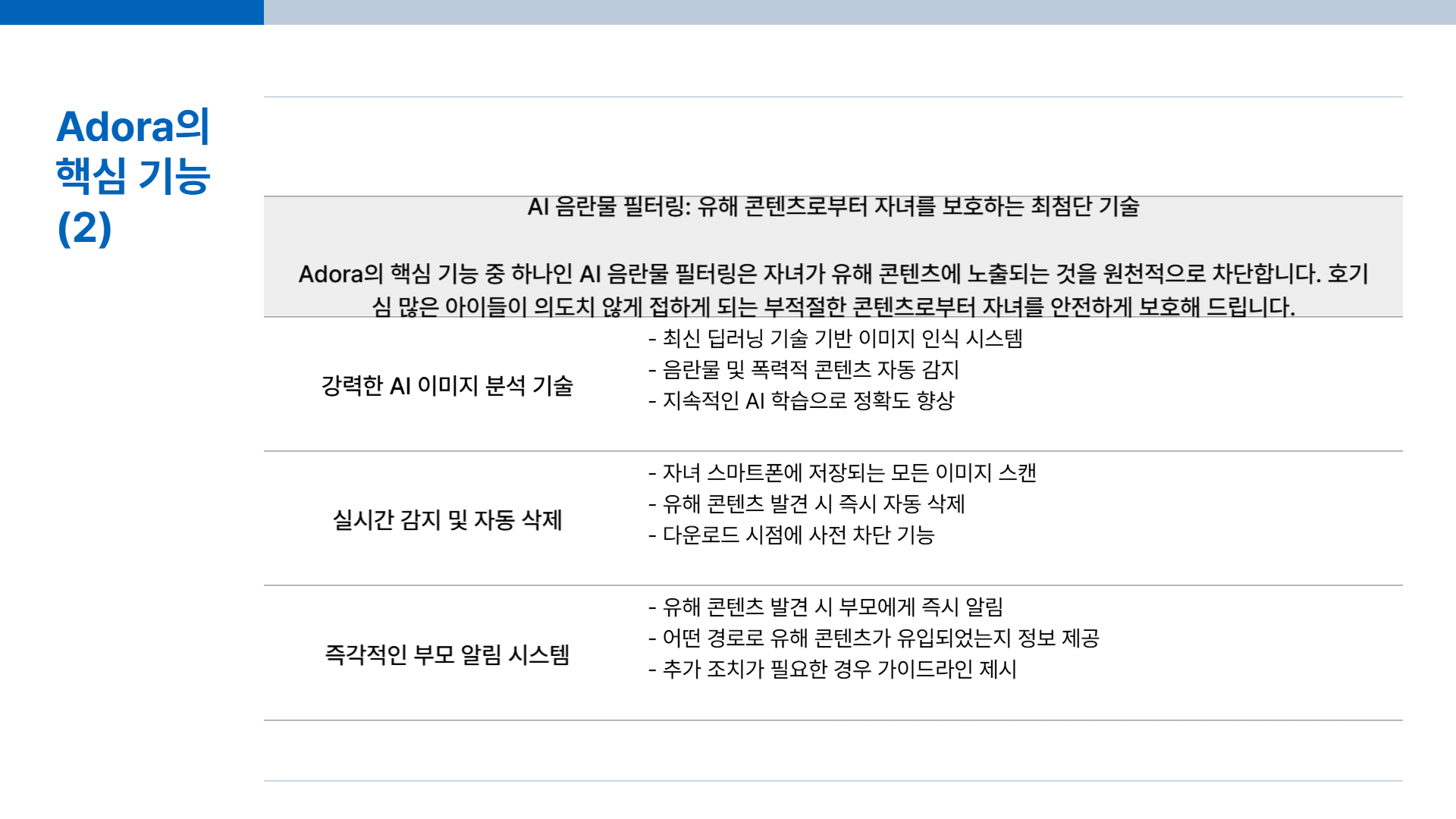 Adora는 부모에게는 마음의 평화를, 자녀에게는 안전한 디지털 환경을 제공하는 것을 목표로 합니다. 최신 AI 기술을 기반으로 한 Adora의 핵심 기능을 자세히 살펴보겠습니다.