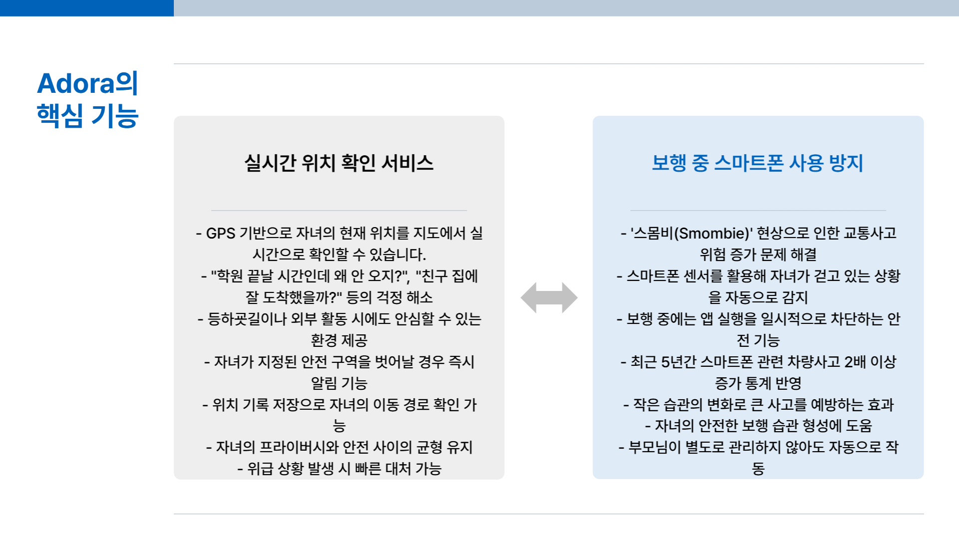 길을 걸으며 스마트폰을 보는 '스몸비(Smombie)'는 심각한 교통사고의 원인이 됩니다. Adora는 스마트폰의 센서를 활용해 자녀가 걷고 있는 상황을 자동으로 감지하고, 보행 중에는 앱 실행을 일시적으로 차단합니다. 작은 습관의 변화로 큰 사고를 예방할 수 있습니다.