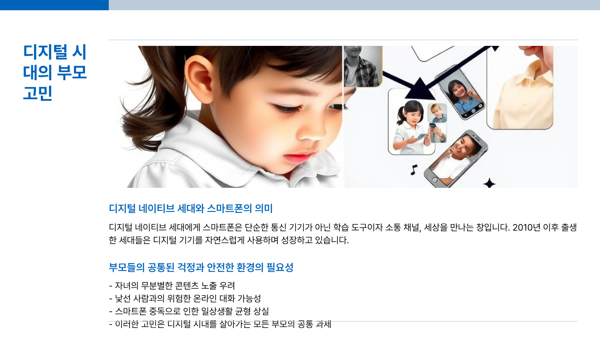 자녀가 무분별한 콘텐츠에 노출되지는 않을까, 혹시 온라인에서 낯선 사람과 위험한 대화를 나누고 있지는 않을까, 스마트폰에 중독되어 일상생활의 균형을 잃지는 않을까… 부모의 마음은 하루도 편할 날이 없습니다. 이러한 고민은 특정 가정의 문제가 아닌, 디지털 시대를 살아가는 모든 부모의 공통된 과제입니다.