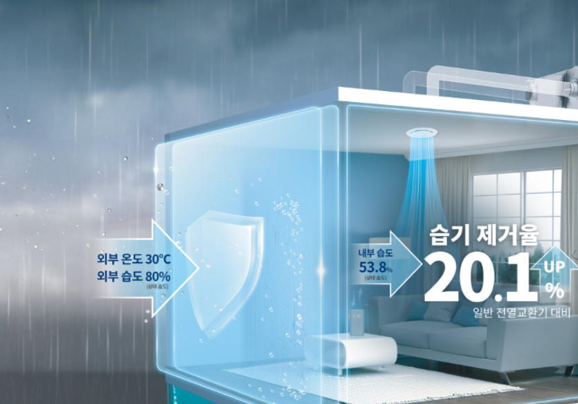 하지만 여기서 중요한 점은 ERV의 습도 조절 기능은 제습기처럼 실내 전체의 습도를 적극적으로 낮추는 개념이 아니라는 것입니다.