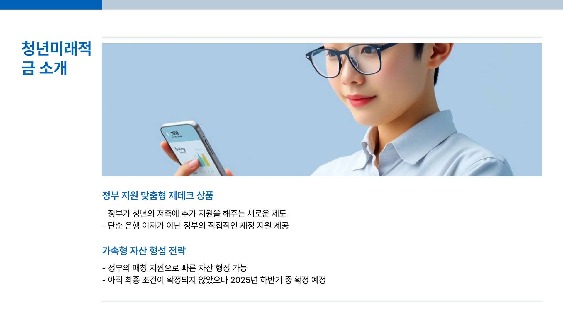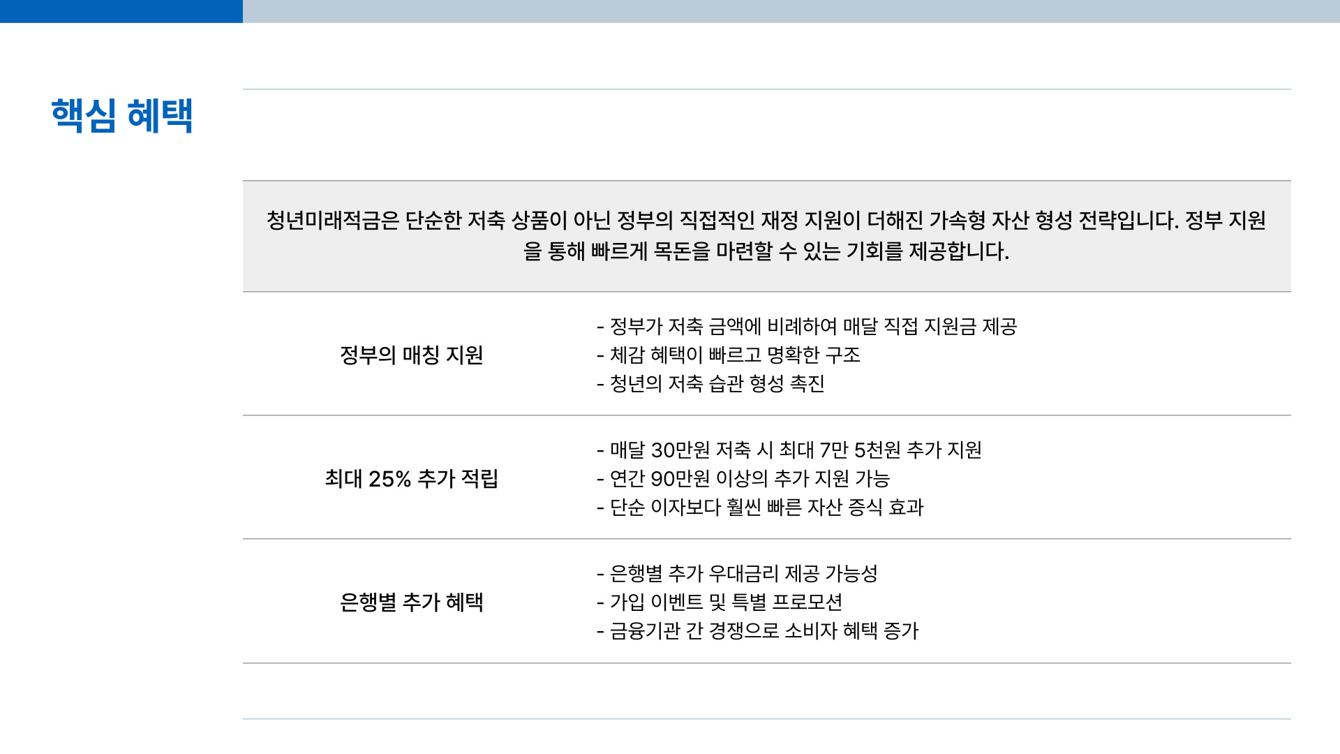 청년미래적금은 단순한 저축 상품이 아닙니다. 정부의 직접적인 재정 지원이 더해진 가속형 자산 형성 전략입니다.