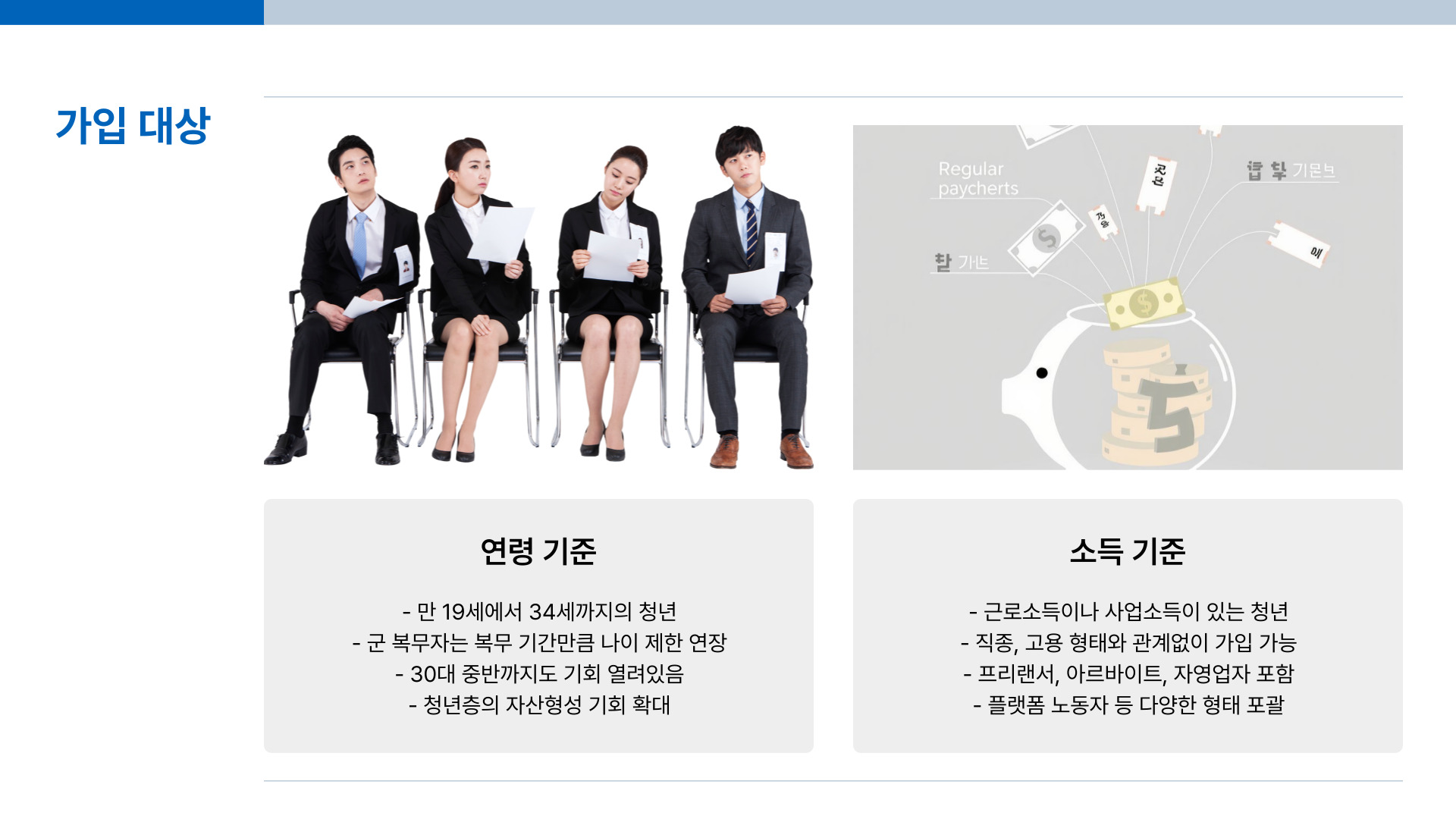 또한, 근로소득이나 사업소득이 있다면 직종, 고용 형태와 관계없이 누구나 가입 가능하다는 점이 특징입니다. 프리랜서, 아르바이트, 자영업자, 플랫폼 노동자 등 다양한 형태의 청년에게 열려 있는 열린 제도입니다.