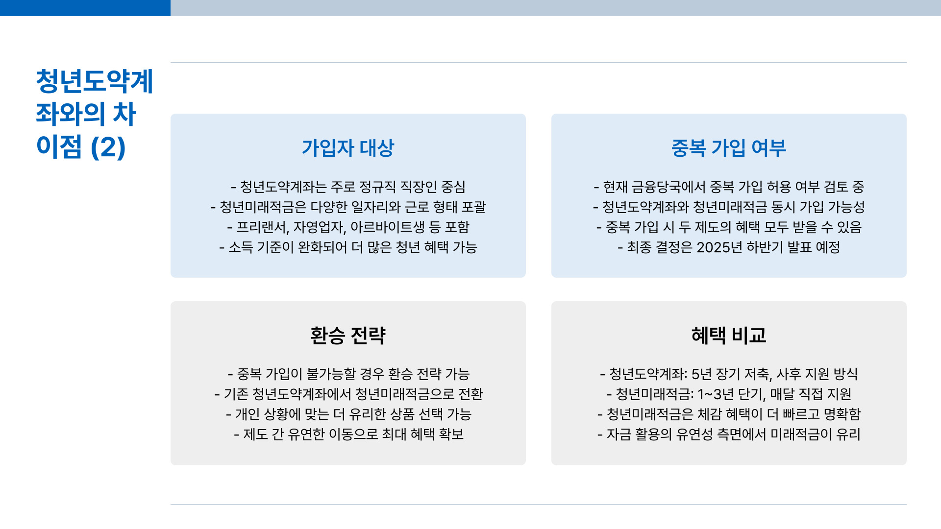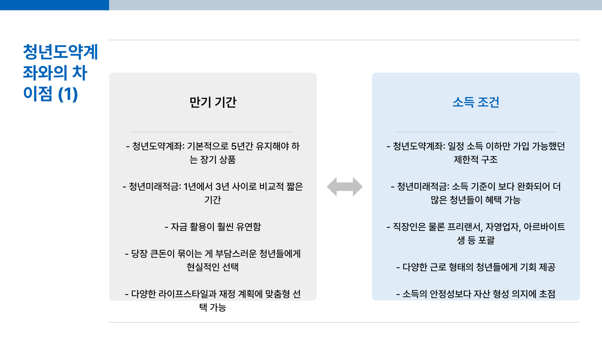 청년미래적금은 기존의 청년도약계좌와는 몇 가지 중요한 차이가 있습니다.