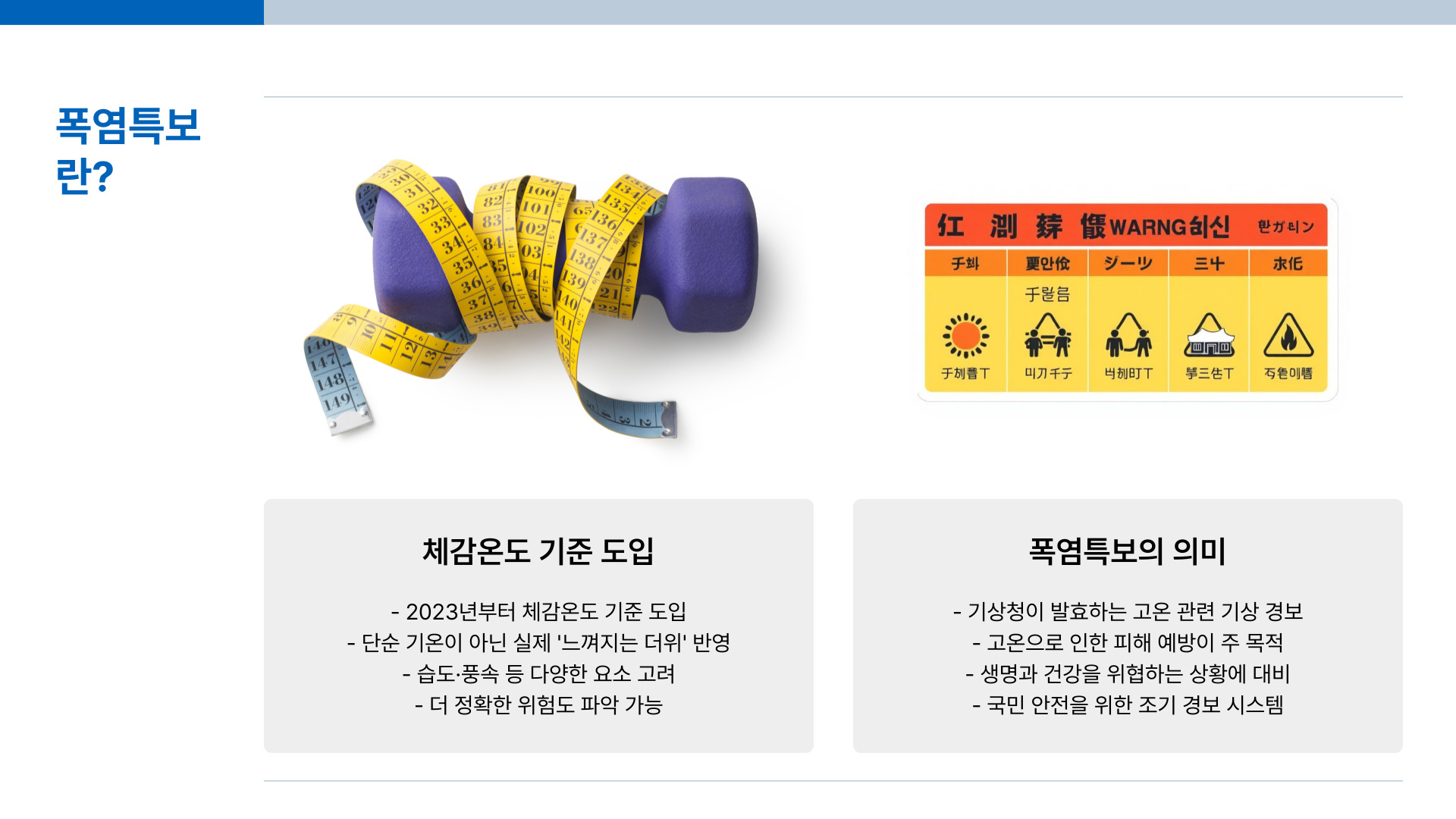 - 폭염경보: 체감온도 35℃ 이상 2일 또는 실제 피해 우려