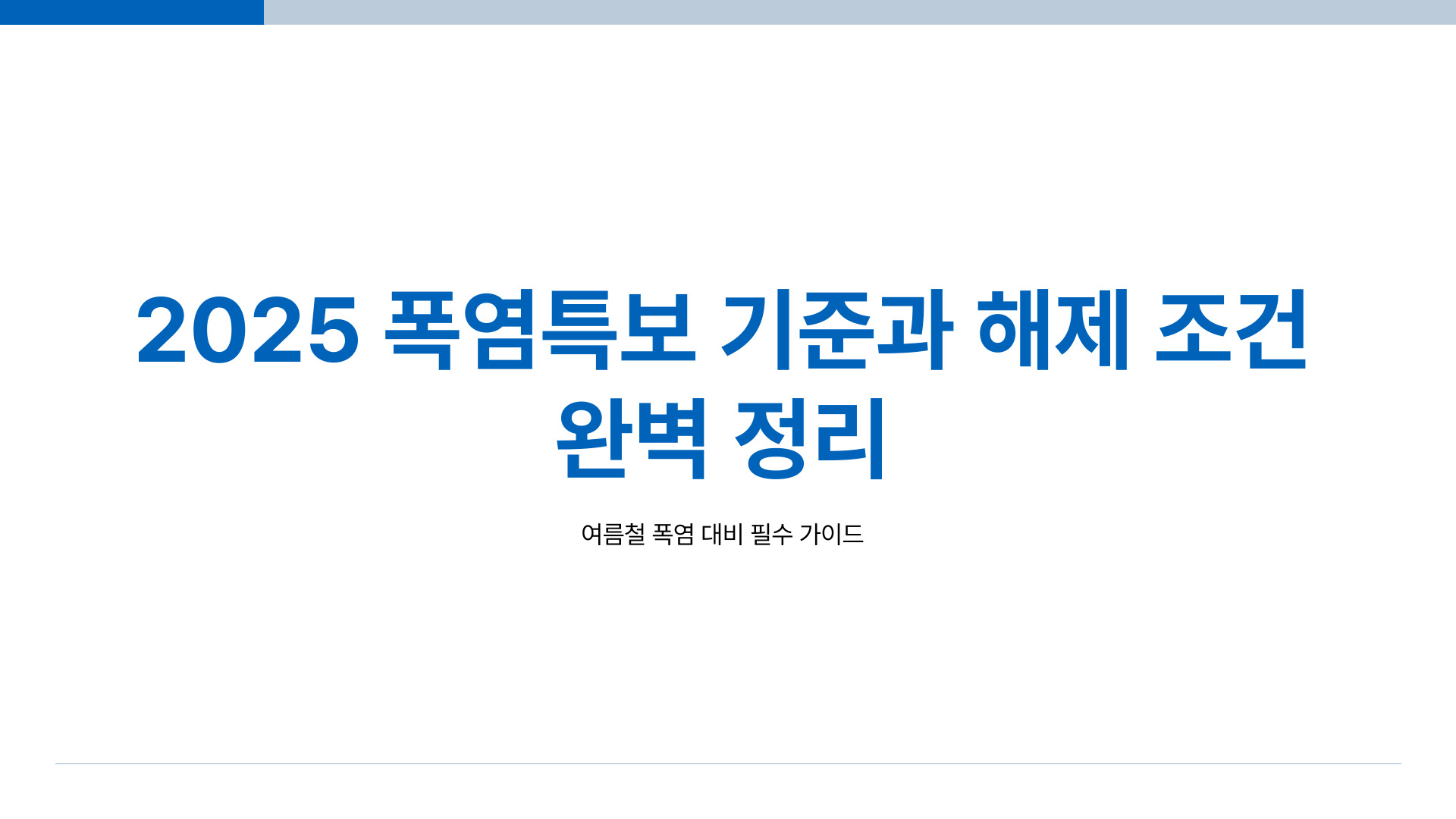 폭염특보는 기상청이 고온으로 인한 피해를 예방하기 위해 발효하는 기상 경보입니다. 2023년부터 체감온도 기준이 도입되었고, 단순 기온보다 실제 ‘느껴지는 더위’를 반영합니다.
