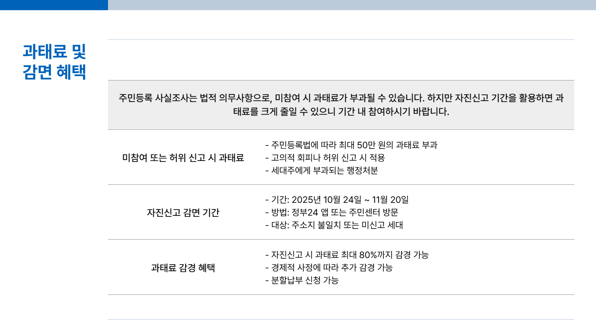 - 감면: 과태료의 최대 80%까지 감경 가능