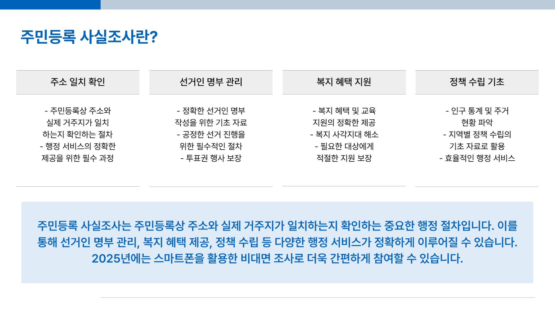 주민등록 사실조사는 주민등록상 주소와 실제 거주지가 일치하는지 확인하는 절차입니다. 이 조사를 통해 다음과 같은 행정 서비스가 정확하게 이루어집니다.