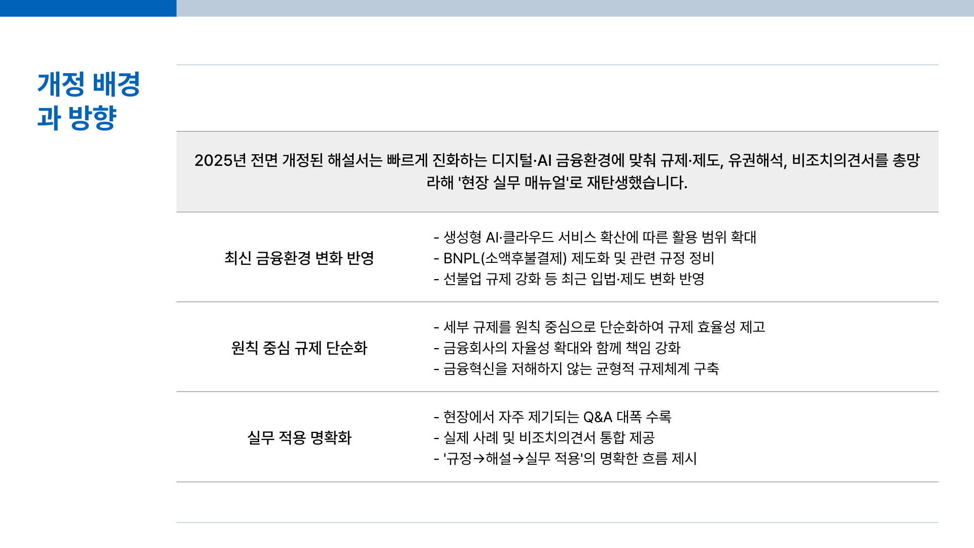 - 생성형 AI·클라우드 확산, BNPL(소액후불결제) 제도화, 선불업 규제 강화 등 최근 입법·제도 변화를 반영.