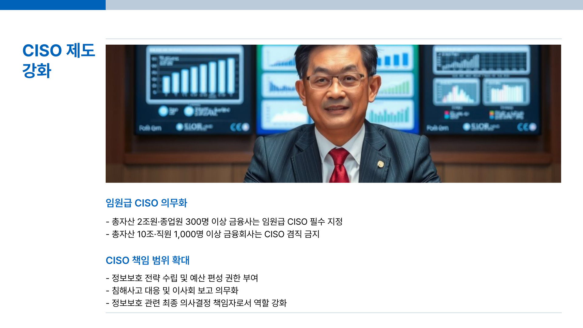 - 총자산 10조·직원 1,000명 이상이면 CISO 겸직 금지.