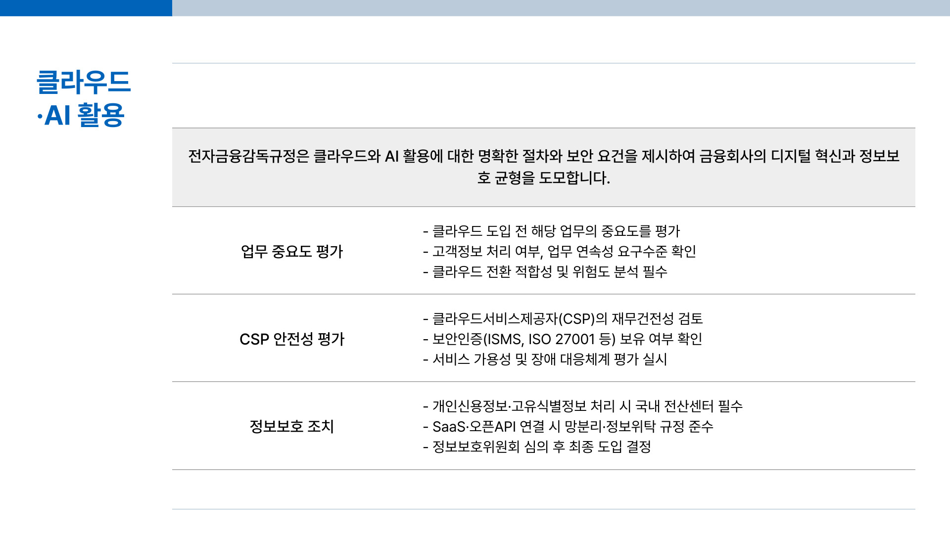 - 업무 중요도 평가 → CSP 건전성·안전성 평가 → BCP·보안조치 → 정보보호위원회 심의 후 사용.
