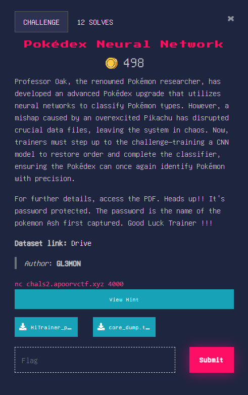 Professor Oak, the renowned Pokémon researcher, has developed an advanced Pokédex upgrade that utilizes neural networks to classify Pokémon types. However, a mishap caused by an overexcited Pikachu has disrupted crucial data files, leaving the system in chaos. Now, trainers must step up to the challenge—training a CNN model to restore order and complete the classifier, ensuring the Pokédex can once again identify Pokémon with precision.