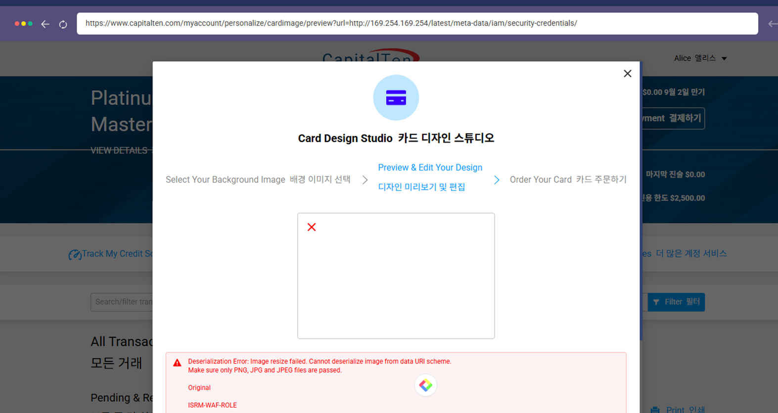 ① 공격자는 카드 디자인 변경 페이지의 파일 업로드 기능을 통해 URL 매개변수 확인