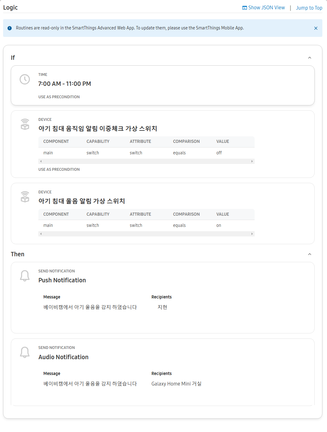 (조건) 아기 침대 울음 알림 가상 스위치 켜지면